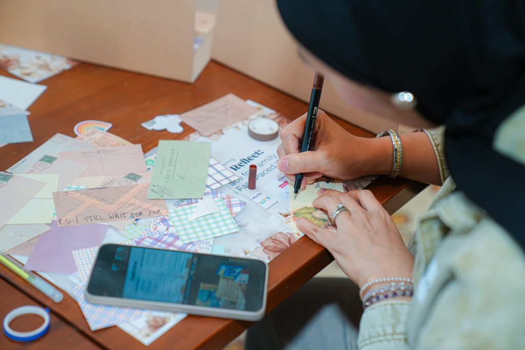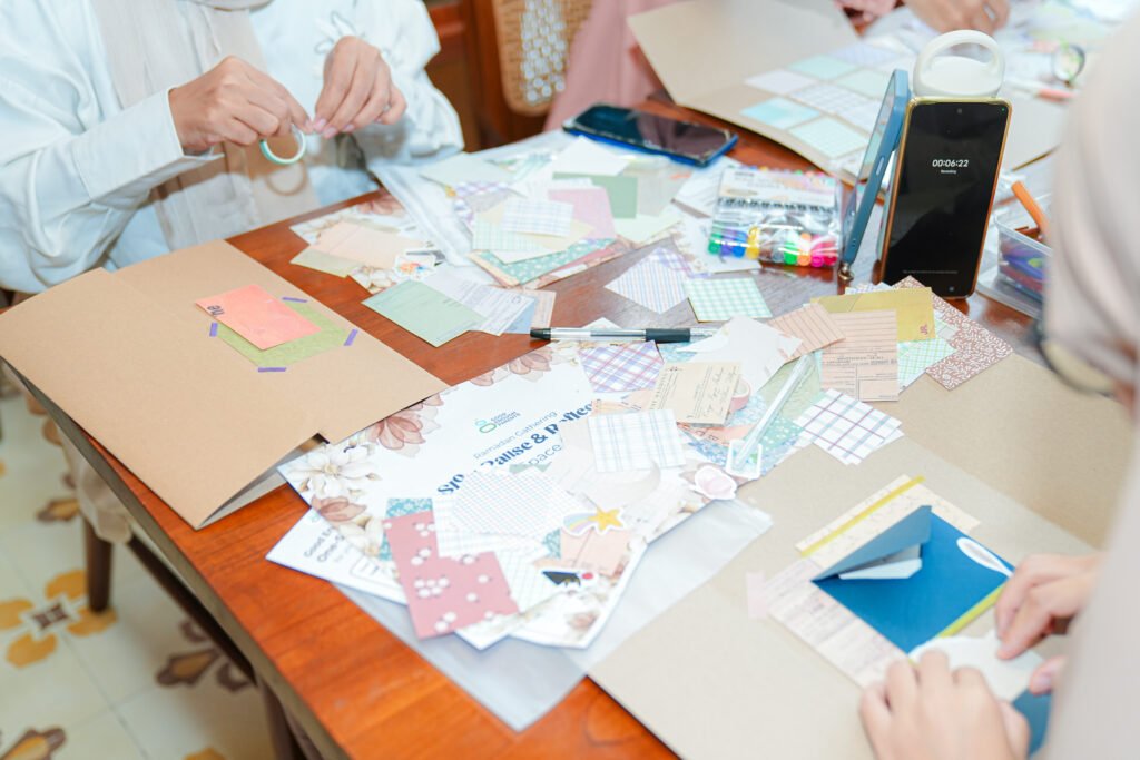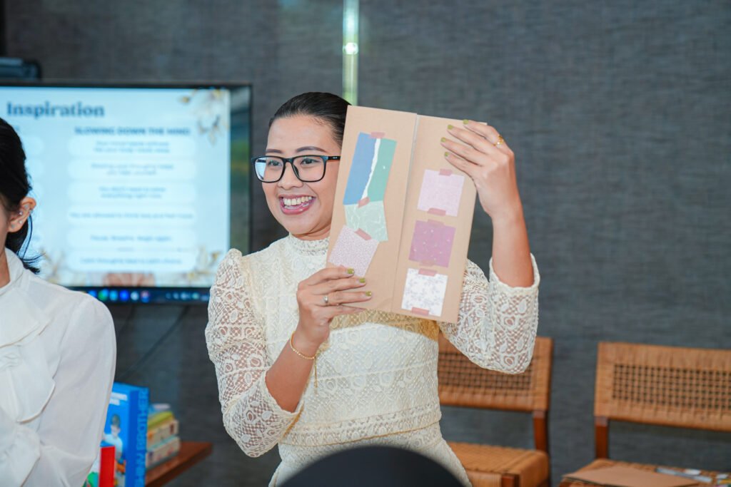 Setelah sesi talkshow, para ibu diajak mengikuti aktivitas reflektif bernama Pause Practice Kit, yaitu sesi scrapbook journaling yang dirancang untuk membantu peserta melambat, menuliskan pikiran, dan memberi ruang bagi diri sendiri.